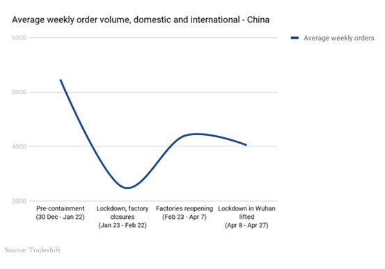 中国周度订单平均规模(包含内贸和外贸)(来源:Tradeshift)