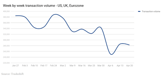 美国、英国、欧洲地区周循环交易量变动图(来源:Tradeshift)