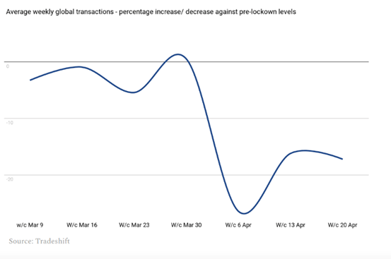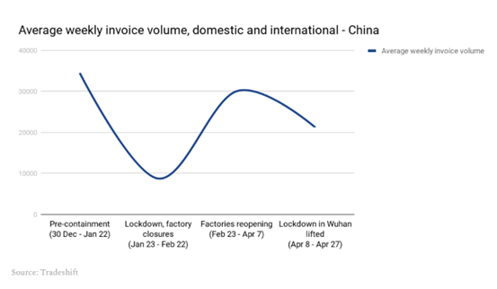 Tradeshift(一家供应链管理的全球平台)的数据,揭示了贸易和需求侧受影响的程度。最初的冲击将继续影响接下来数个月的走势。在中国,内贸和外贸交易从2月中旬开始,周环比下降56%。美国,英国和欧洲走出了相似的曲线,4月初下降26%,到了4月底下滑17%。